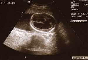 Prenatal care visit. Ultrasonographic (US) severe hydrocephalus, and alobar holoprosencephaly (a developmental anomaly). Hydranencephaly occurs after the brain and ventricles have Ultrasound evaluation of the fetal neural axis. In: Callen ... Access Document